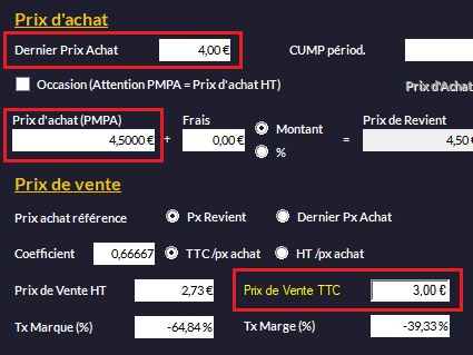 ☝Il se peut que la colonne Total surligne en rouge votre prix de vente. C'est une alerte qui vous prévient que vous vendez à perte. Rendez-vous sur la fiche article du produit concerné pour vérifier que le prix de vente est bien supérieur au PMPA et au Dernier Prix d'Achat. Si Dernier Prix d'Achat n'est pas renseigné, renseignez-le.