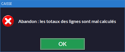 Info technique : un contrôle de cohérence entre le total et le lignes de vente est effectué au moment de la saisie, ainsi qu'un contrôle de la présence de la TVA. Un message d'erreur apparaîtra si un problème est détecté au moment d’appuyer sur Total :