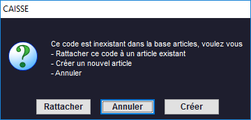 Si l'option Création des Articles à la Volée en Caisse est cochée (Fichier -> Paramètres -> Configuration -> Articles rubrique Options Articles) et que vous scannez un code-barres inconnu, le logiciel vous proposera de créer directement l'article ou de rattacher ce code-barres inconnu à un article existant :