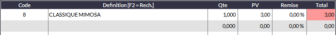 🡺 Une fois l'article choisi, une ligne apparaît récapitulant le code, la dénomination, la quantité, le prix de vente, etc.