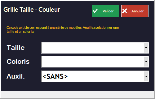 Vous choisirez manuellement la taille, le coloris et éventuellement auxiliaire (pour plus d'informations, voir chapitre Options Métiers - Prêt à Porter (Taille et Coloris)). |