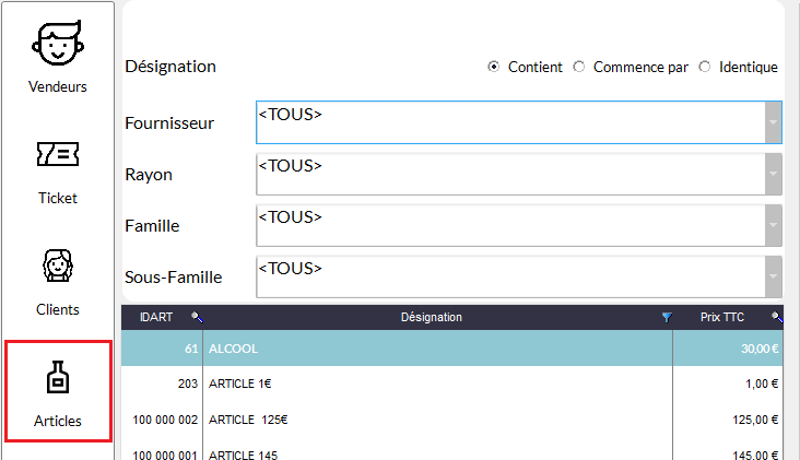 ☝Attention aux cas de codes similaires dans plusieurs rubriques : imaginons l'article A ayant pour IDArt 4, l'article B ayant pour référence fournisseur 4 et l'article C ayant pour multicode 4. Si vous tapez 4 en caisse (colonne Code) le logiciel fera la recherche dans cet ordre : multicode puis référence fournisseur puis IDArt. C'est donc l'article C qui apparaîtra.