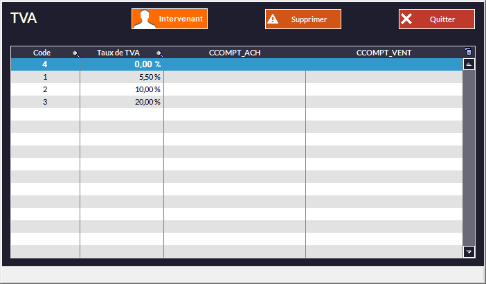 Pour supprimer un Taux de TVA, cliquez sur la ligne souhaitée puis sur le bouton