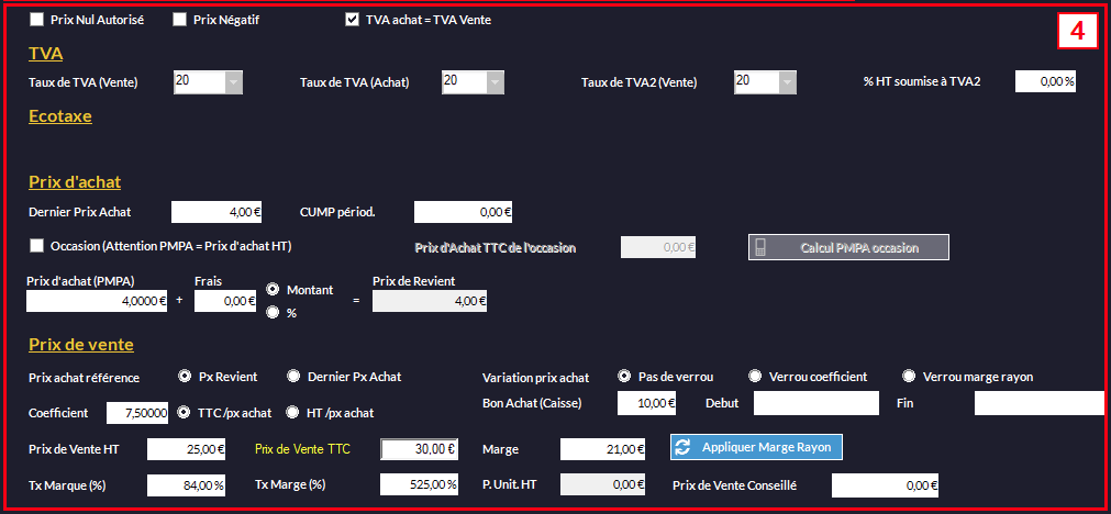 oSi nécessaire, cochez la case Occasion : le calcul de la TVA lors de vente en sera modifié. Vous devrez donc renseigner le prix d'achat TTC dans le champ prévu à cet effet et recalculer le PMPA de l'article à l'aide du bouton