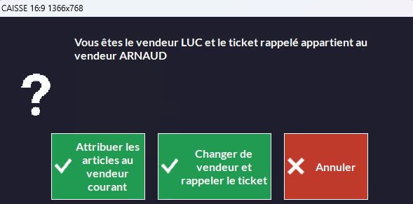 Si vous faites un rappel attente alors que le ticket d'un autre y est resté, ce message vous proposera un choix. - Si le client revient, le ticket peut être rappelé au nom d'Arnaud avec le bouton Changer... (ou Luc avec le bouton Attribuer...) pour finaliser sa vente. - Si le client ne revient pas, le ticket peut être aussi annulé au nom de l'un ou de l'autre. Comme les clôtures ne peuvent être faites si un ticket reste en attente, ce message vous permet de les gérer même si le vendeur d'origine n'est plus là. |