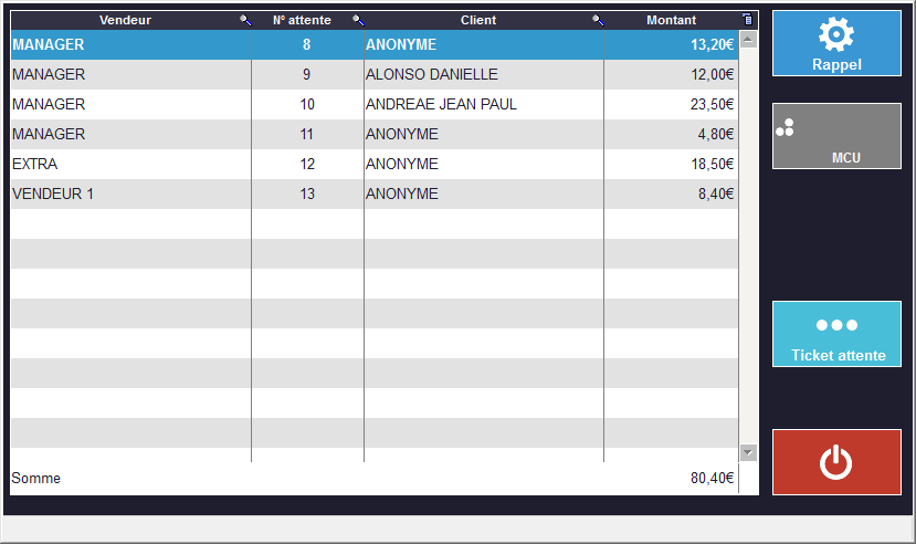 N.B. : Si vous mettez en attente un ticket et que vous changez de vendeur, quand vous reviendrez sur le premier vendeur, seul son ticket sera listé dans le tableau Attente qui apparaîtra.