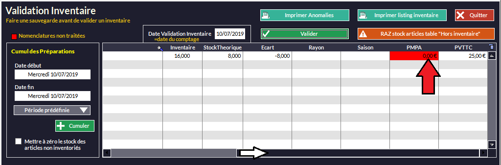 S'il reste des articles ayant un prix d'achat (PMPA) à zéro, un message vous préviendra et les cases PMPA des articles concernés seront rouges :