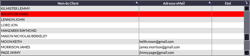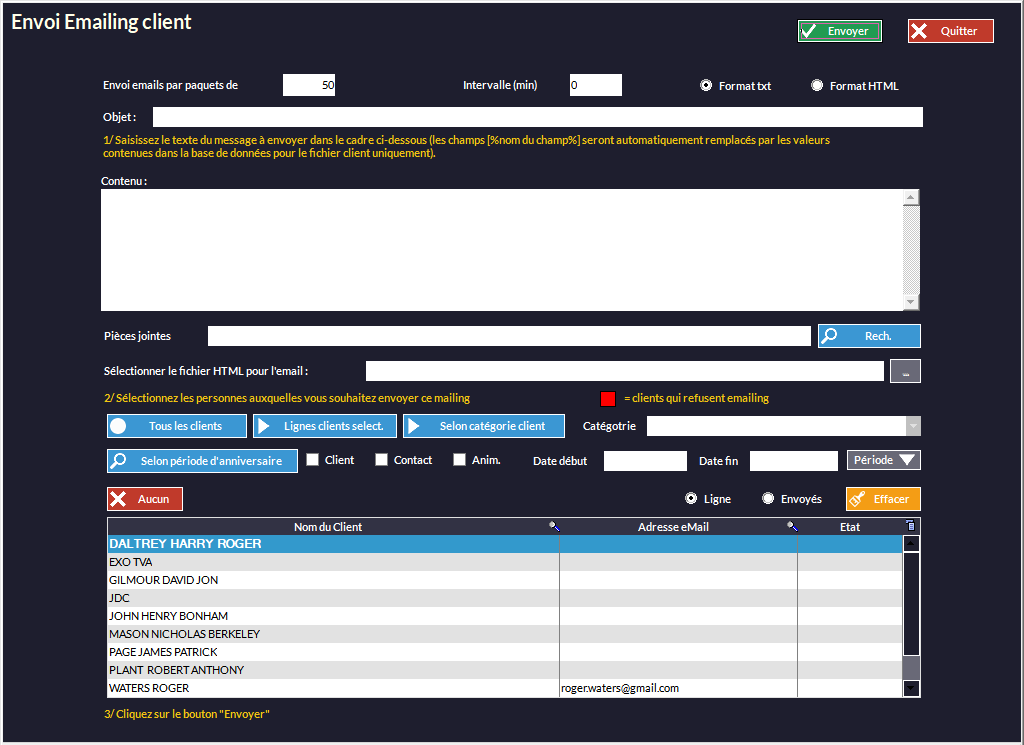 Tous vos clients s'affichent ici, même ceux qui n'ont pas d'adresse e-mail renseignée dans leurs fiches. Ceux surlignés en rouge sont ceux qui ont refusé l'e-mailing (voir RGPD). |